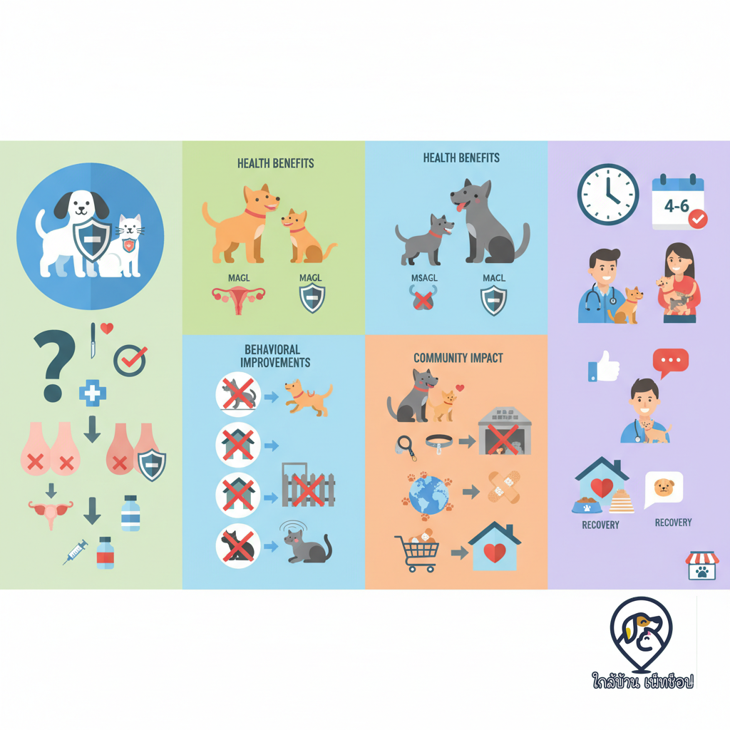 - ในเพศเมีย: ช่วยลดความเสี่ยงของมะเร็งเต้านมและมะเร็งรังไข่ได้อย่างมาก อีกทั้งยังป้องกันการเกิดภาวะมดลูกอักเสบเป็นหนอง (Pyometra) ซึ่งเป็นภาวะฉุกเฉินที่อันตรายถึงชีวิต