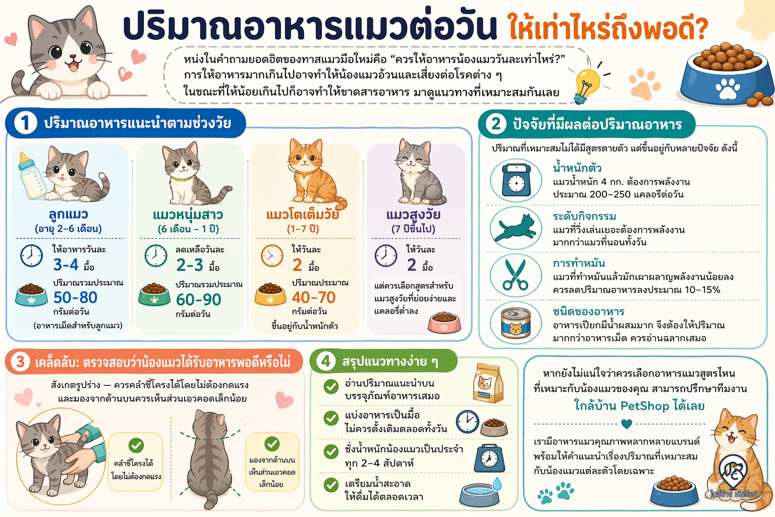 💡 เคล็ดลับ: วิธีง่าย ๆ ในการตรวจสอบว่าน้องแมวได้รับอาหารพอดีหรือไม่ คือ สังเกตรูปร่าง — ควรคลำซี่โครงได้โดยไม่ต้องกดแรง และมองจากด้านบนควรเห็นส่วนเอวคอดเล็กน้อย