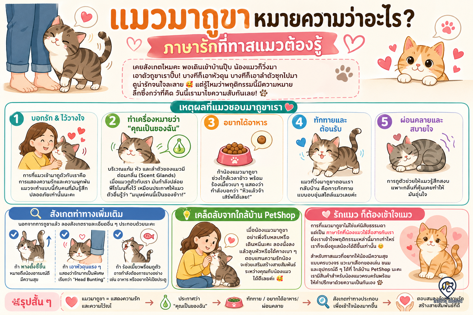 การที่แมวมาถูขาไม่ใช่แค่นิสัยธรรมดา แต่เป็น ภาษารักที่น้องแมวใช้สื่อสารกับเรา ยิ่งเราเข้าใจพฤติกรรมเหล่านี้มากเท่าไหร่ เราก็จะยิ่งดูแลน้องได้ดีขึ้นเท่านั้น 😊